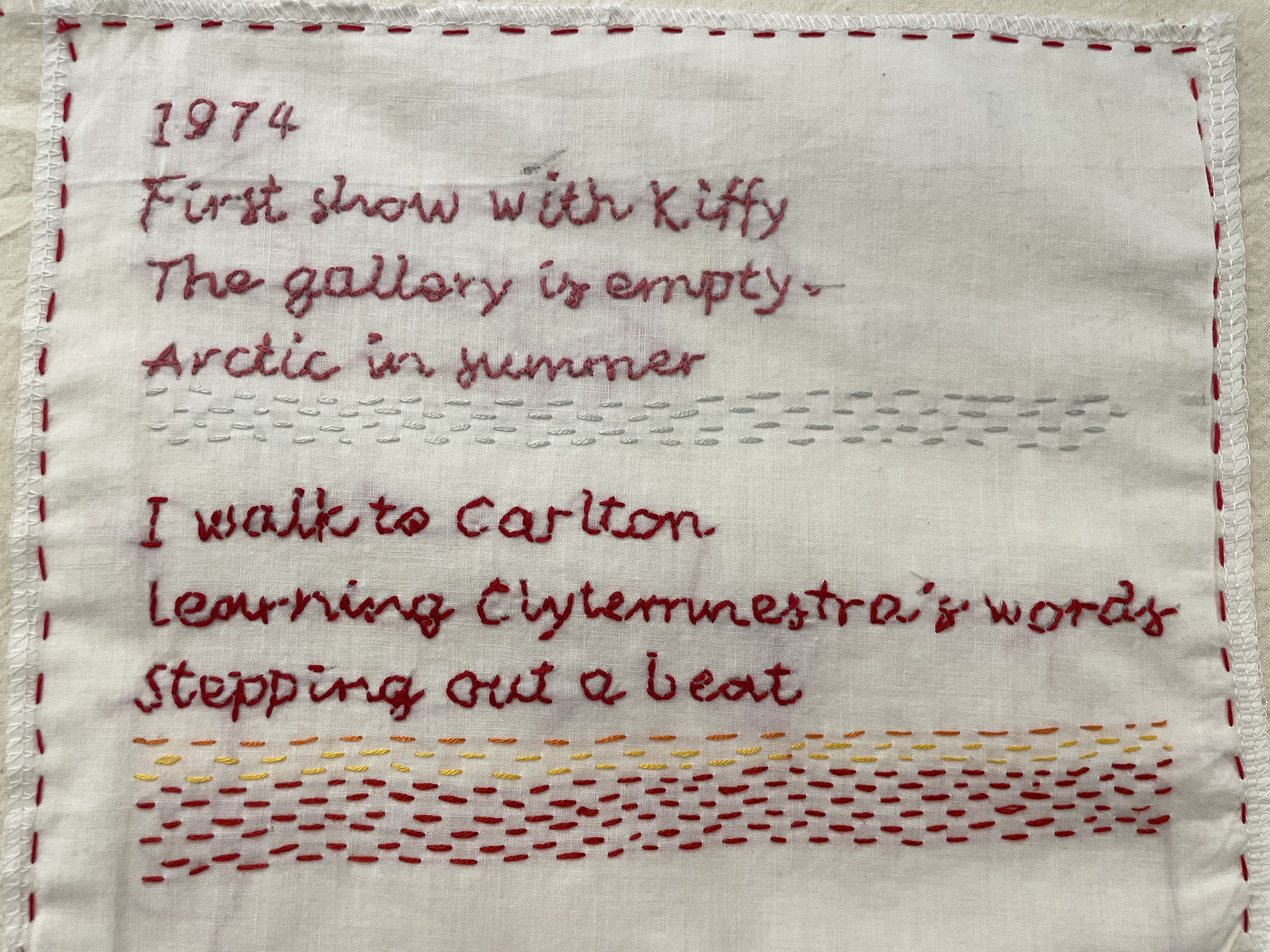 Meredith Rogers work opens the exhibition. A wall of uniformly sized stitched works each documenting one year of the artist’s life experience from her early childhood to the present. Meredith’s work holds the exhibitions together in some respects as she demonstrates an art- as-life feminist methodology.